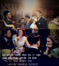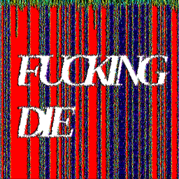 >>373>>374Oh no it's fine; glitch art could use some more edge; I really dig the last one, like a fucked up screensaver overlaid atop a theater curtain. Viewership's eyes hacked to pieces in an effort to show them a not-so subliminal message.