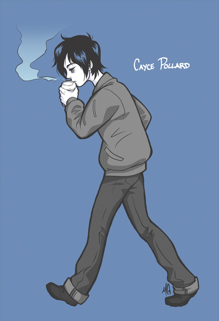 I do dress in mainly black and shades of gray but it's not from any intentional cosplay of Cayce Pollard, I've just dressed this way since I started picking out my own clothing as kid, long before Pattern Recognition was even written.