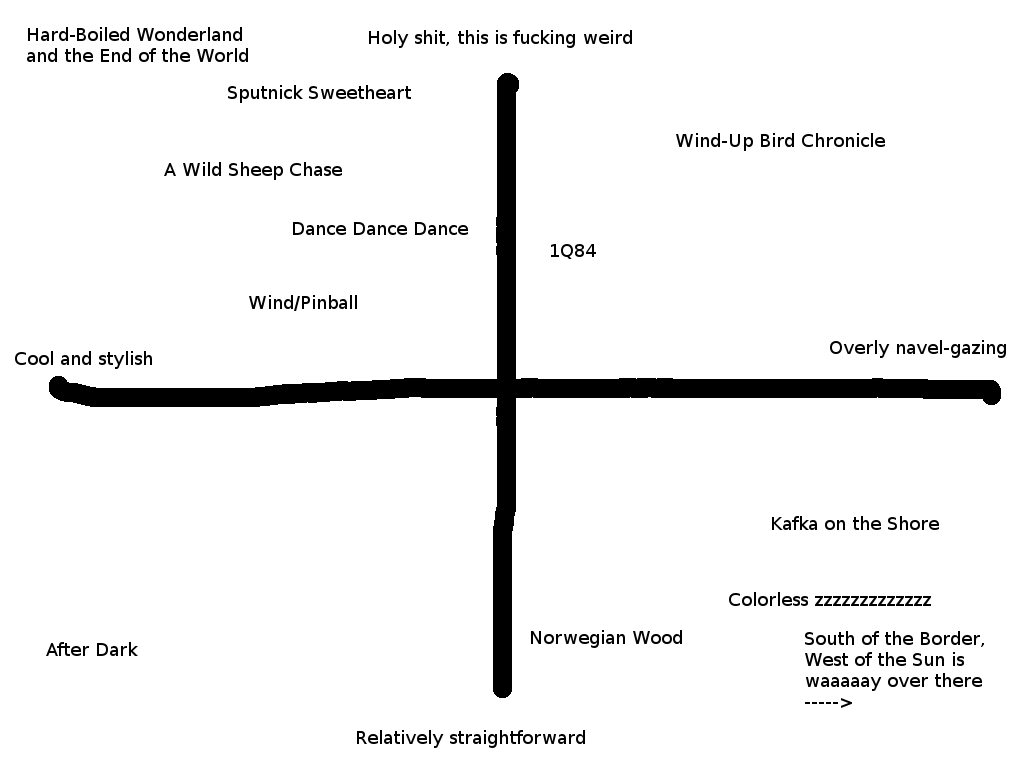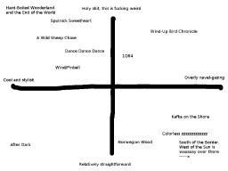 His other work can be roughly described by a two-axis system, where one axis ranges from "relatively straightforward" to "holy soykaf this is fucking weird", and the other axis ranges from "cool and stylish" to "overly navel-gazing". Where his books fall on these axes is a matter of opinion, but my personal opinion can be summed up by the attached image.