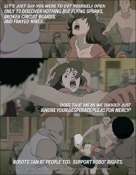 You and a person you know, trust, and appreciate are out and about, doing whatever it is y'all do. Shopping, going out to eat, whatever. At one point something happens; your friend is crossing the street, doesnt see, a car comes out of no where and hits him down. You rush to see, to help if you can, and where parts of his skin are scrapped off on the pavement there is no blood, but a leakage of wires, some fluids leaking from pipes.