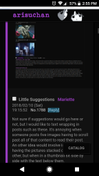 >>2339>Some thumbnails became tall and blurry, can you restore them?The images didn't change. I just edited the CSS such that any thumbnails thinner than 256px be stretched to fit that size, which can make the smaller thumbnails a bit blurry. However, I have updated the thumbnail resolution to 384px by 384px so only images with the tallest aspect ratio will be stretched instead of shrunk in the future.